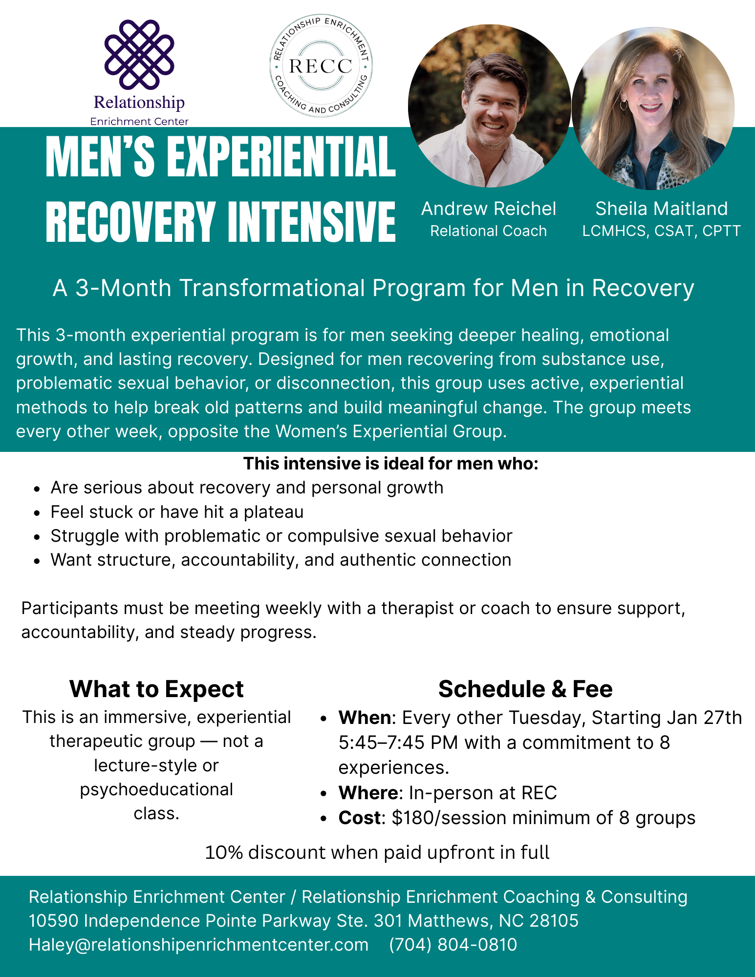 This 3-month experiential program is for men seeking deeper healing, emotional growth, and lasting recovery. Designed for men recovering from substance use, problematic sexual behavior, or disconnection, this group uses active, experiential methods to help break old patterns and build meaningful change. The group meets every other week, opposite the Women’s Experiential Group.